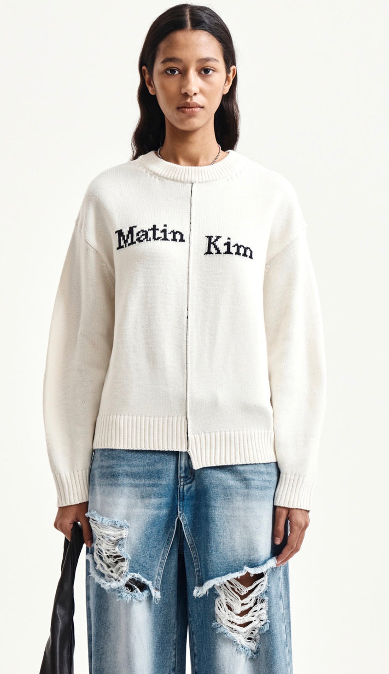 Matin Kim ASYMMETRIC LOGO KNIT PULLOVER IN IVORY