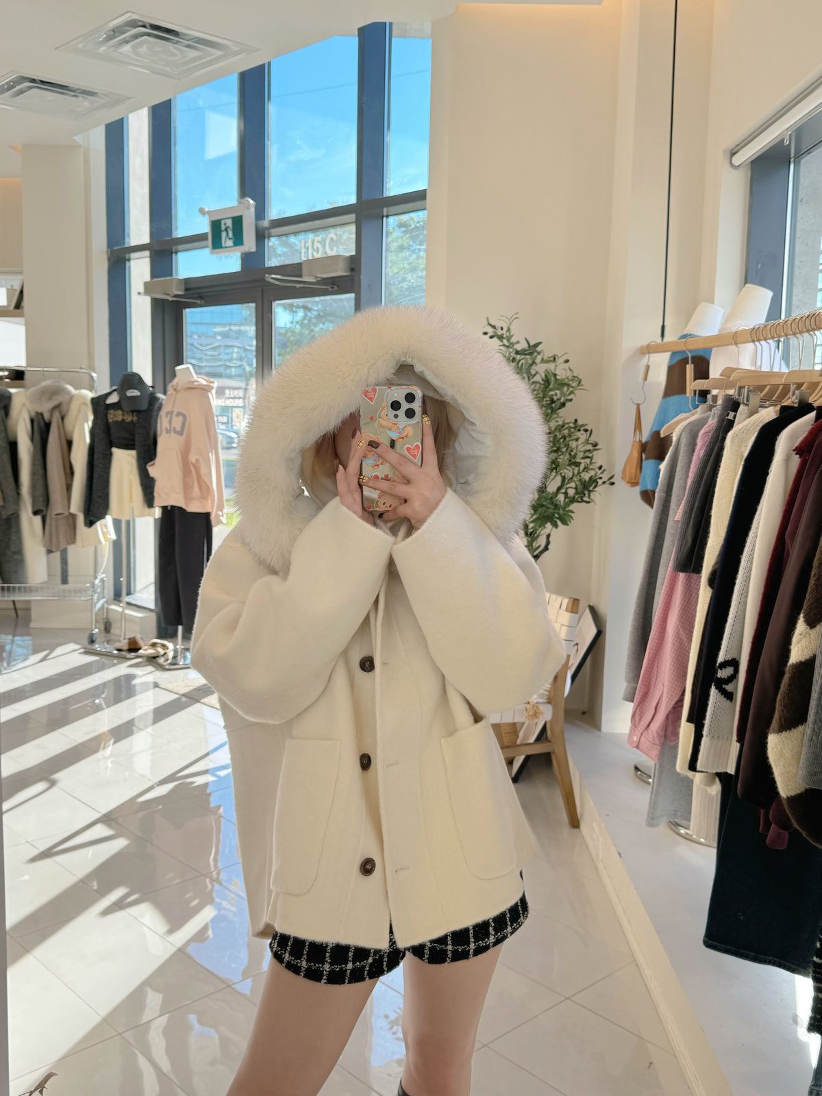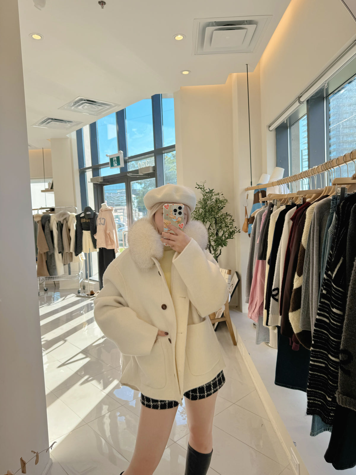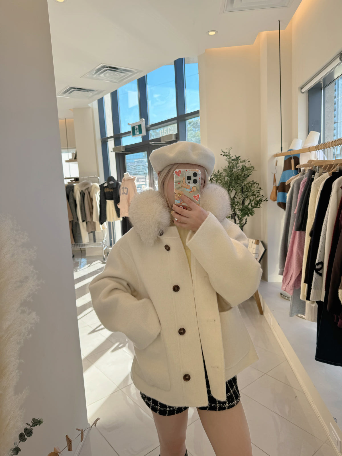 Short coat with fox fur collar