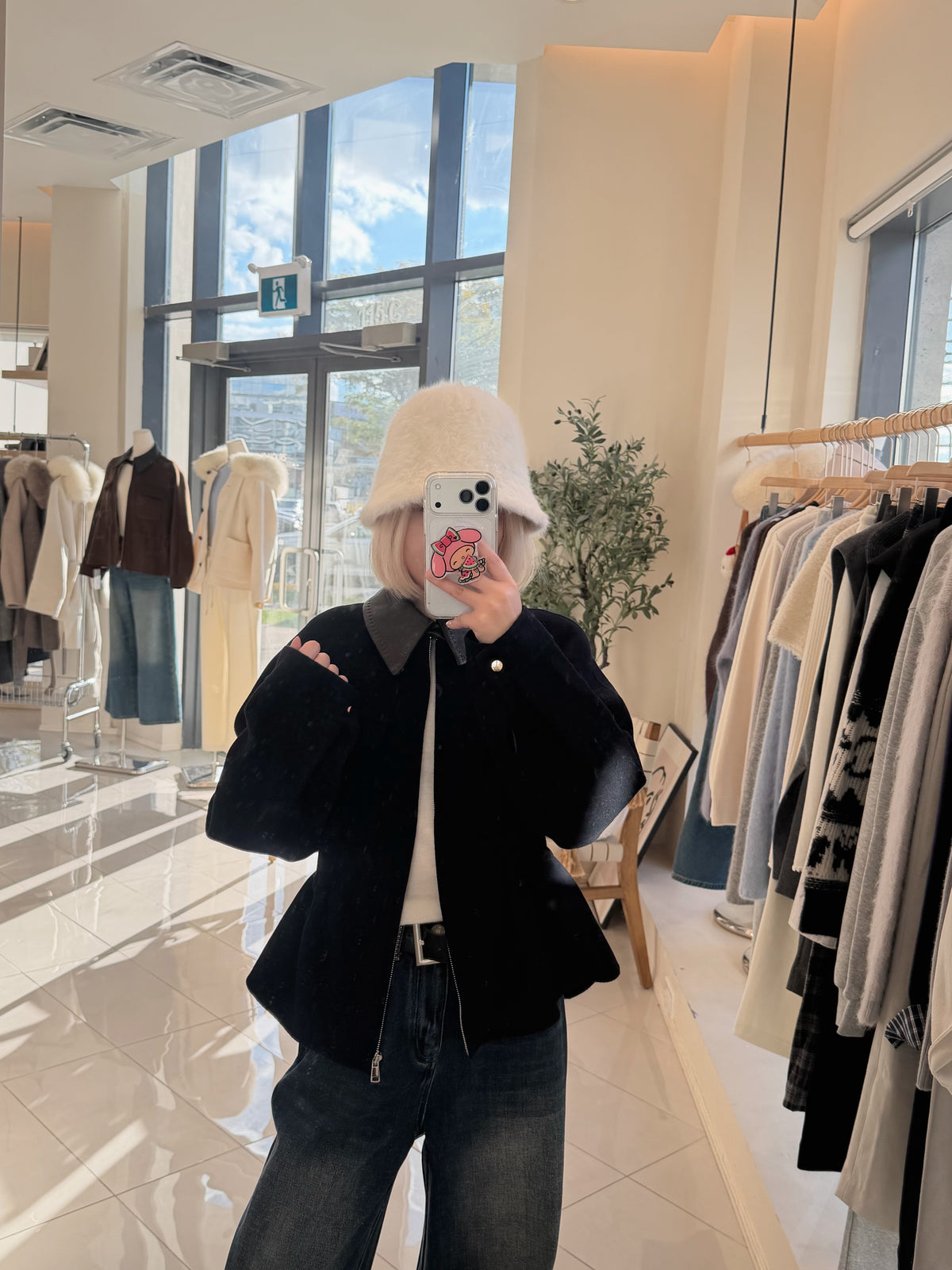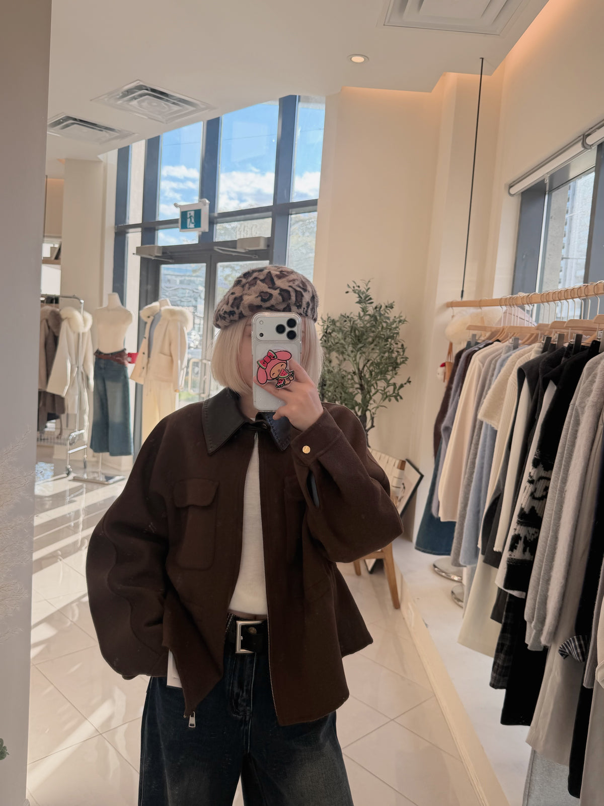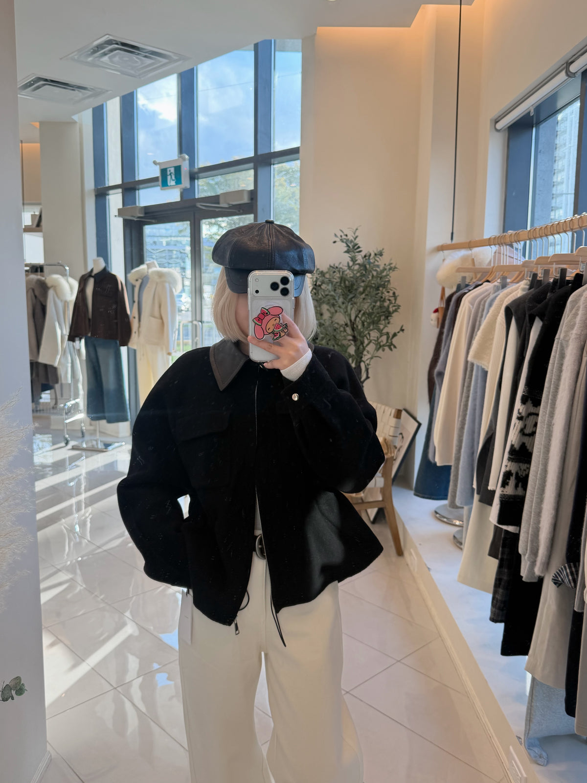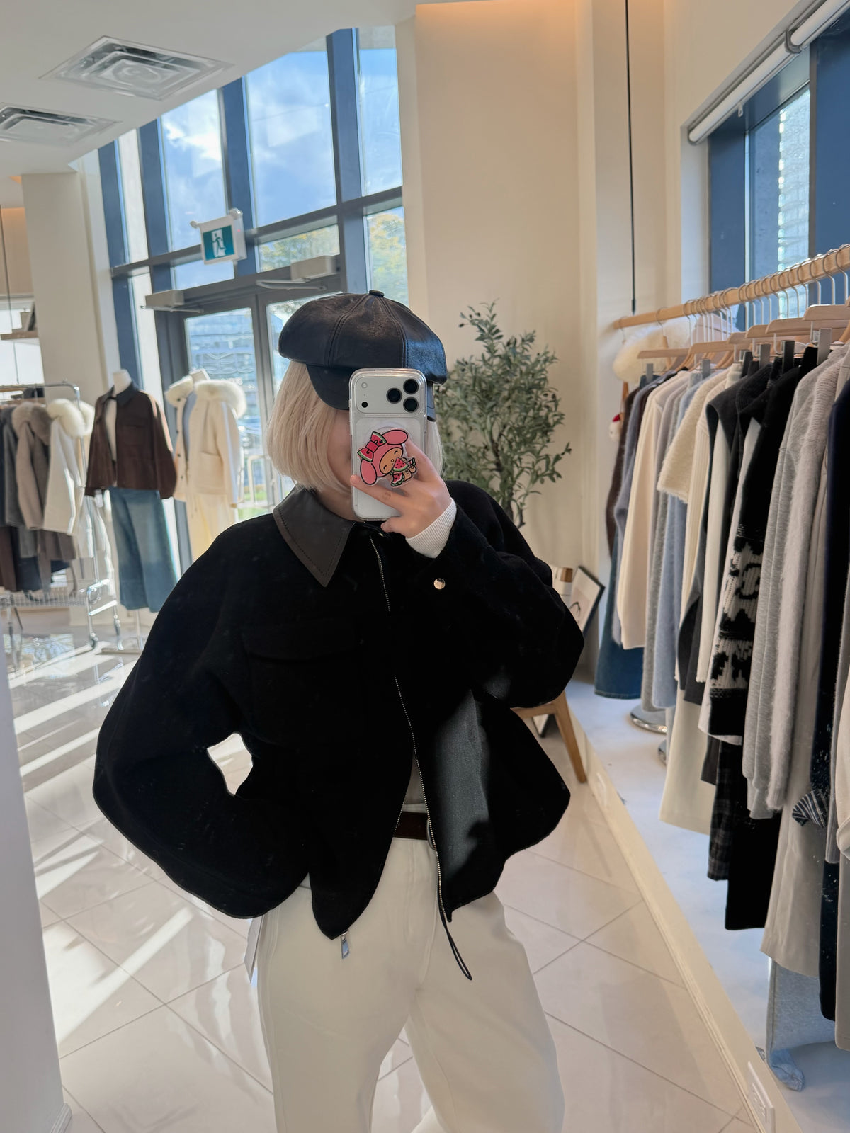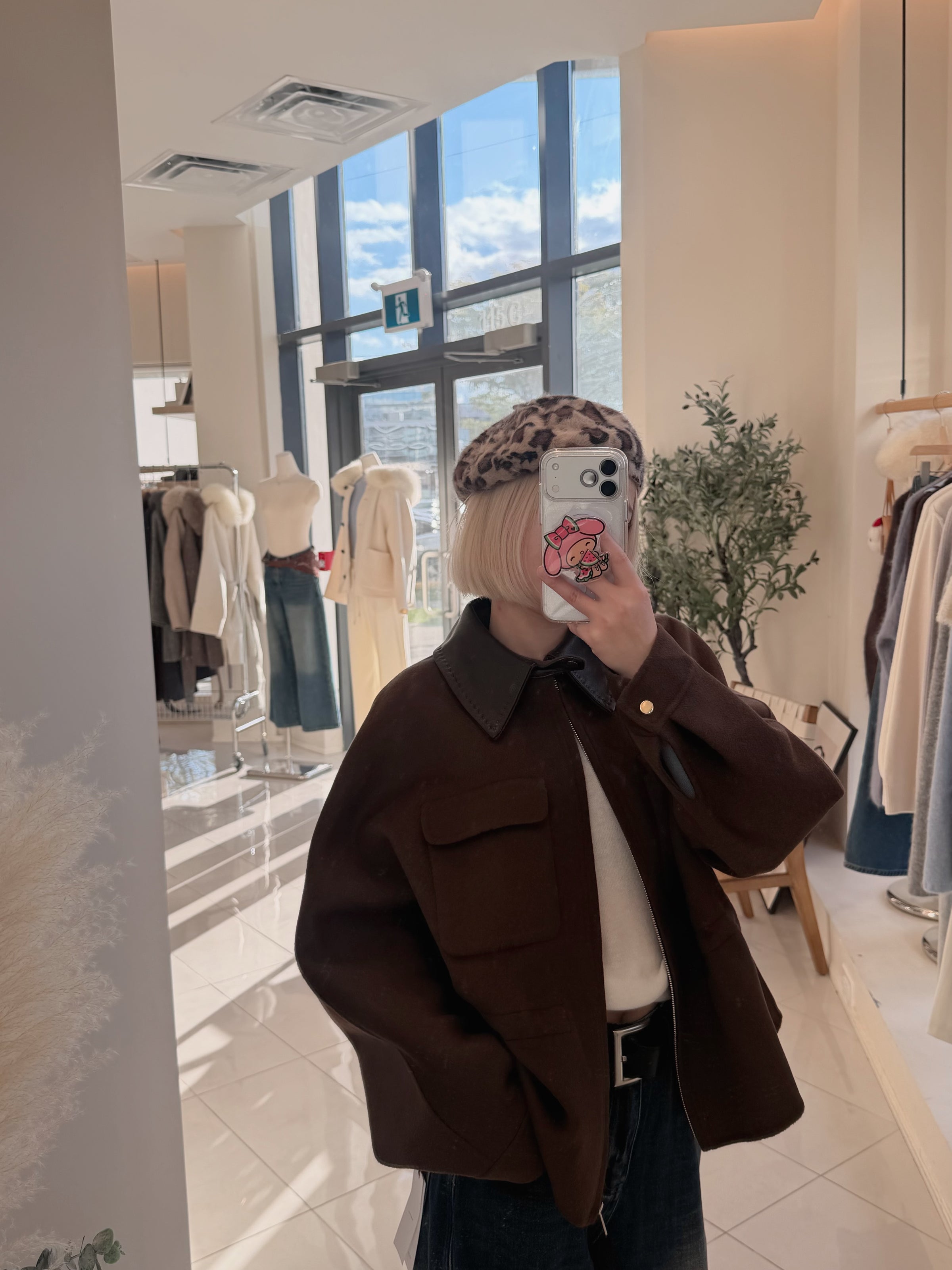 Faux leather collar ajustable waist wool jacket
