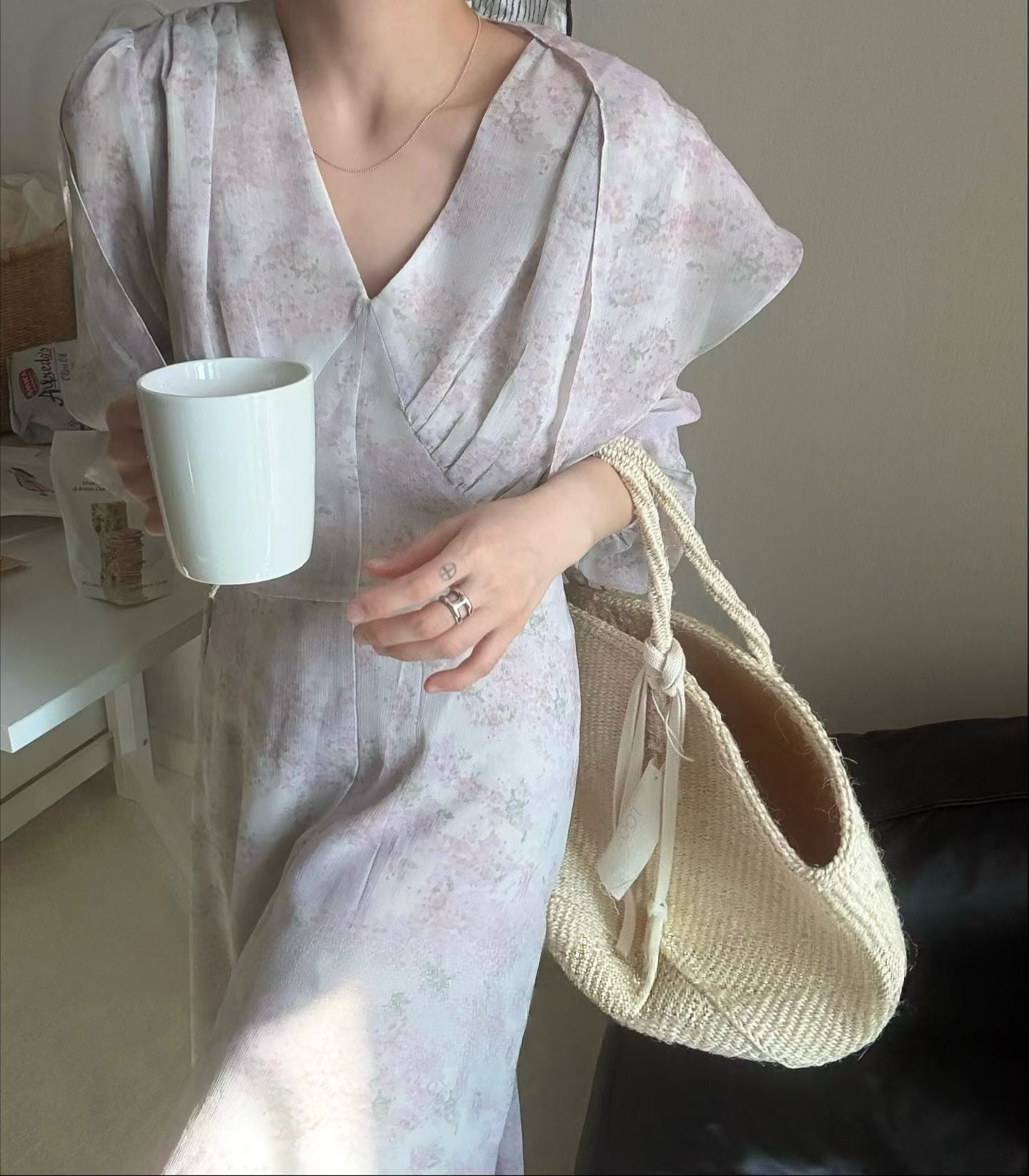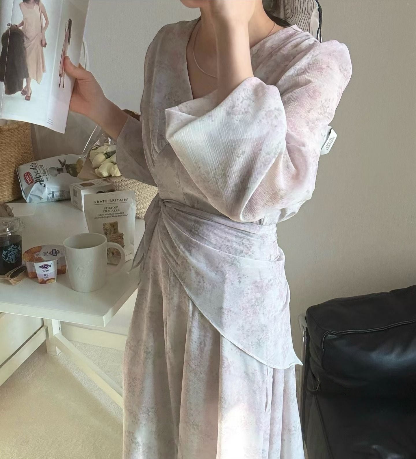 IMISSYOU V-neck floral long dress with scarf in Light Purple