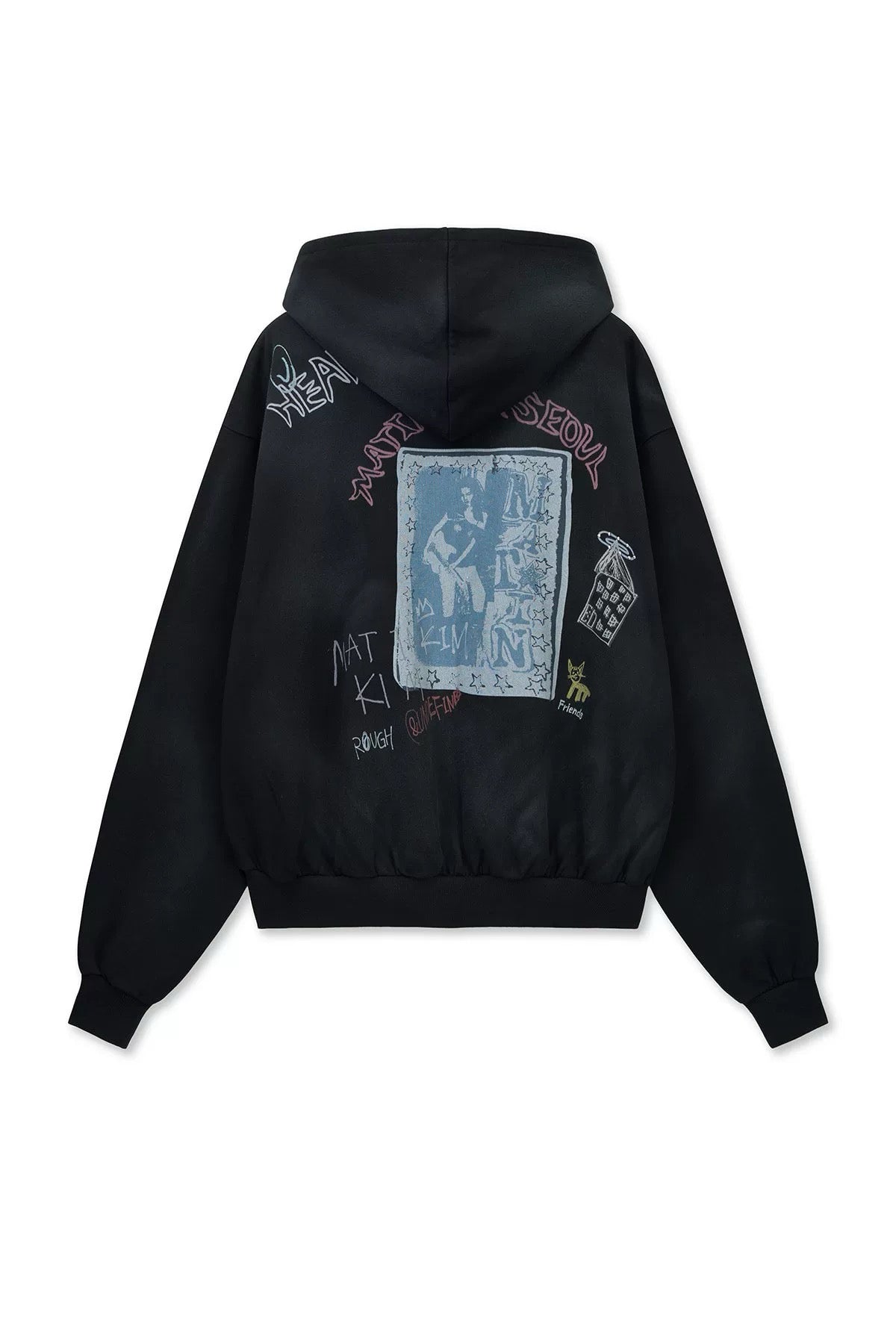 MATIN KIM Vintage Washed Graffiti Hoody Zip Up in Black