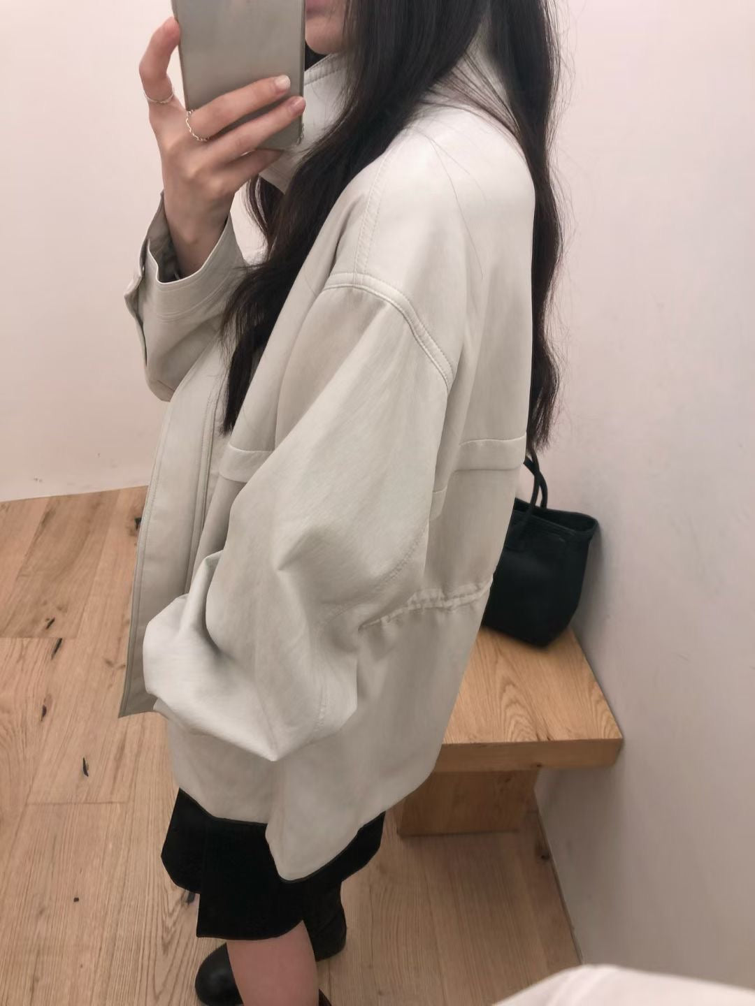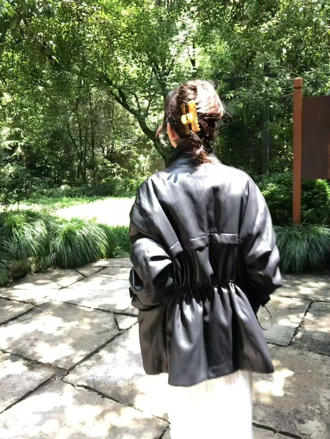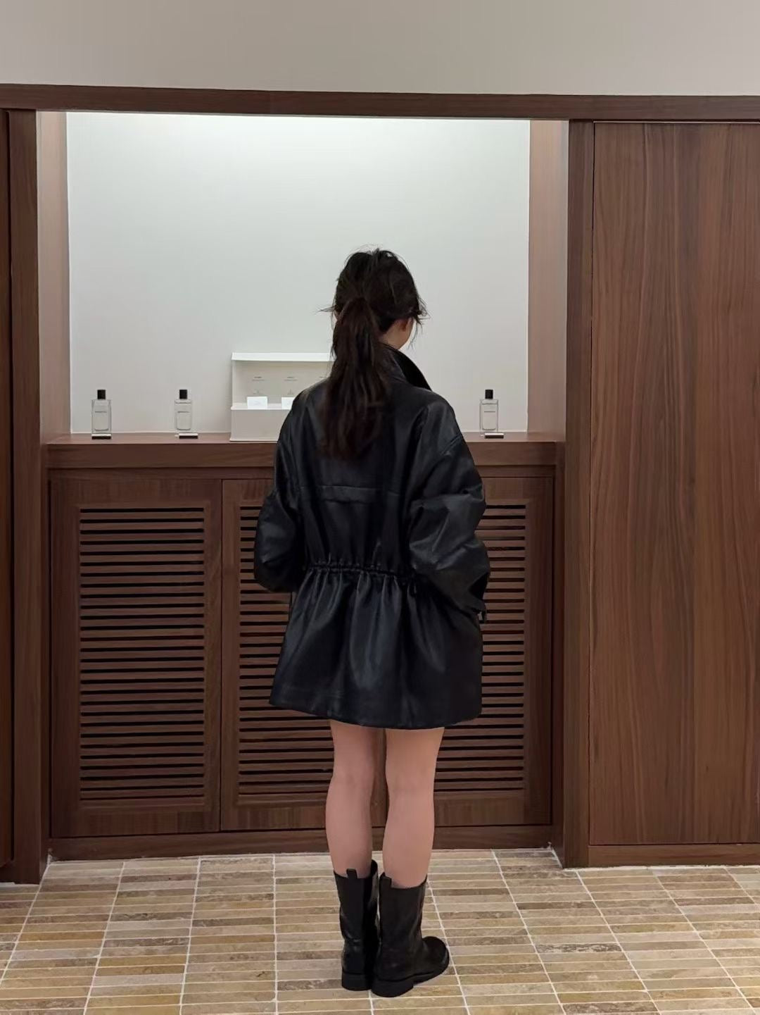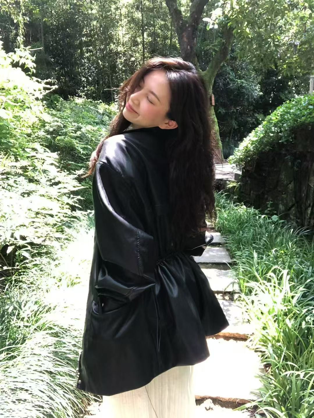 Stand collar ajustable waist faux leather jacket