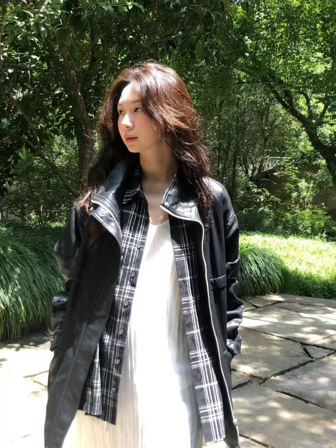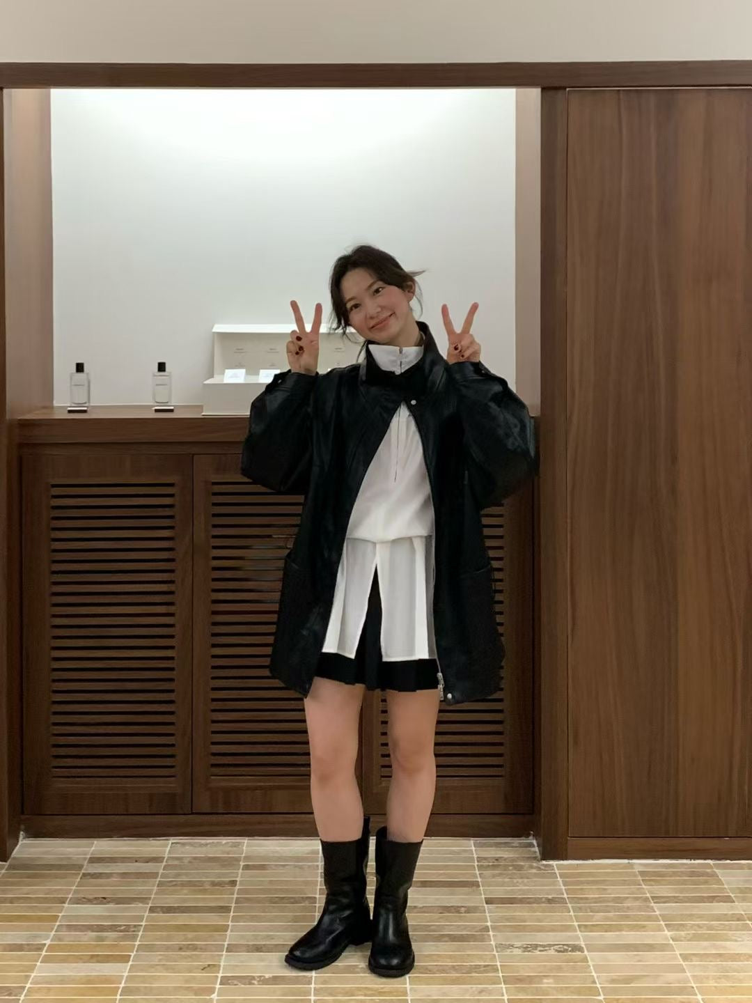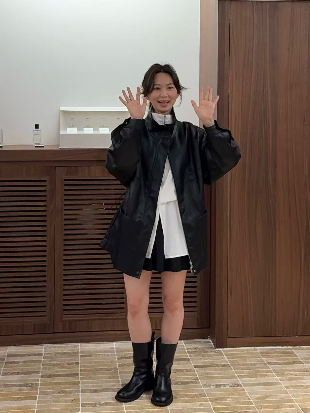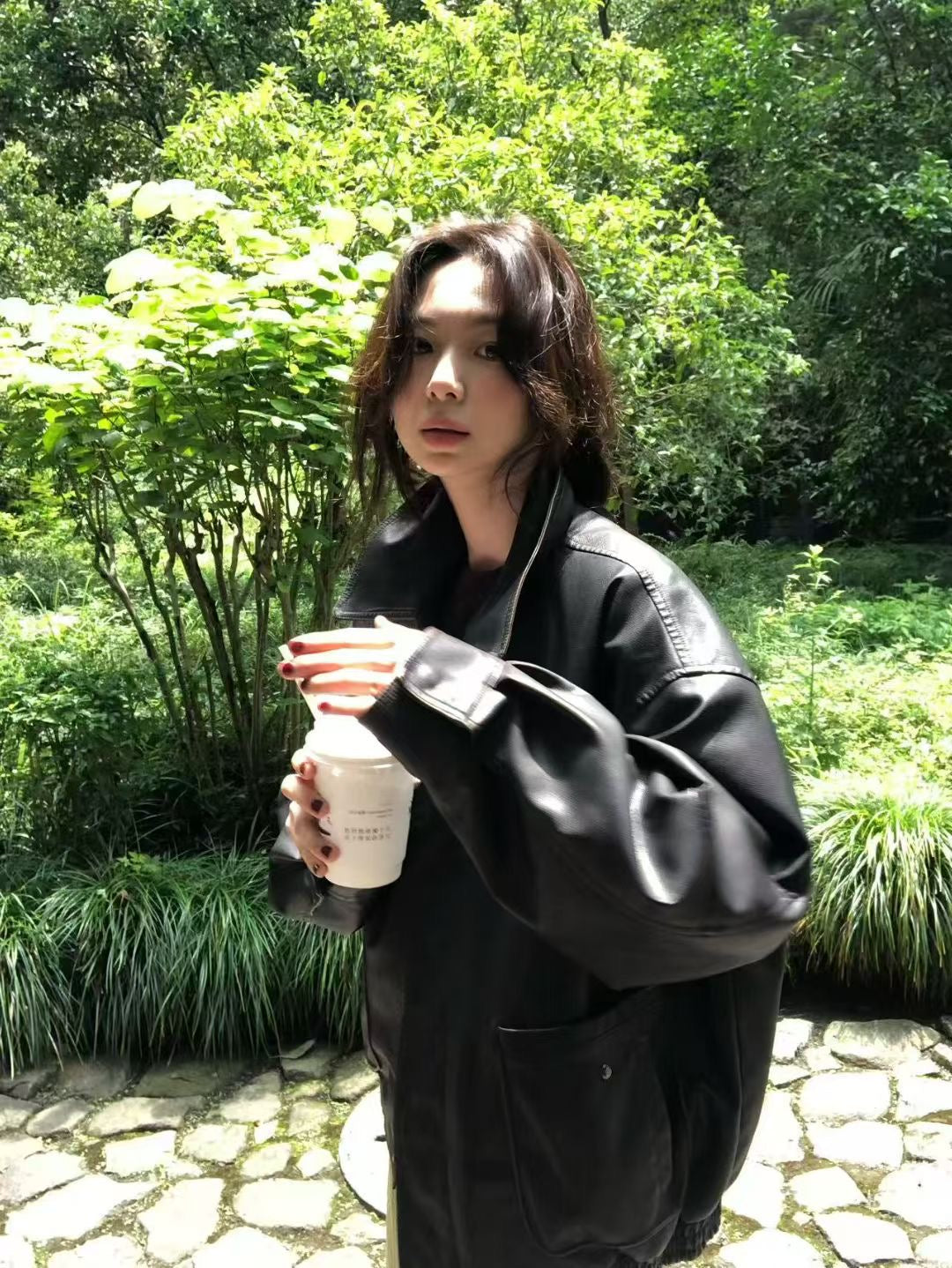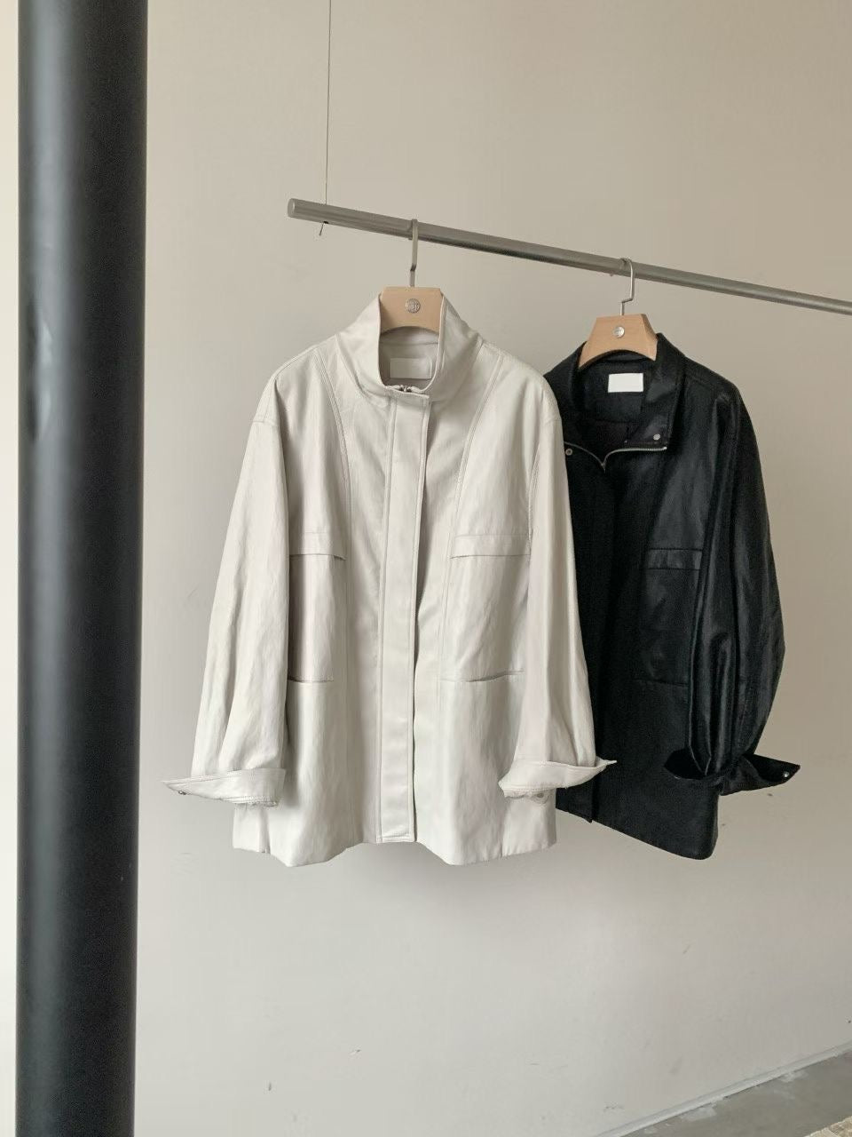 Stand collar ajustable waist faux leather jacket
