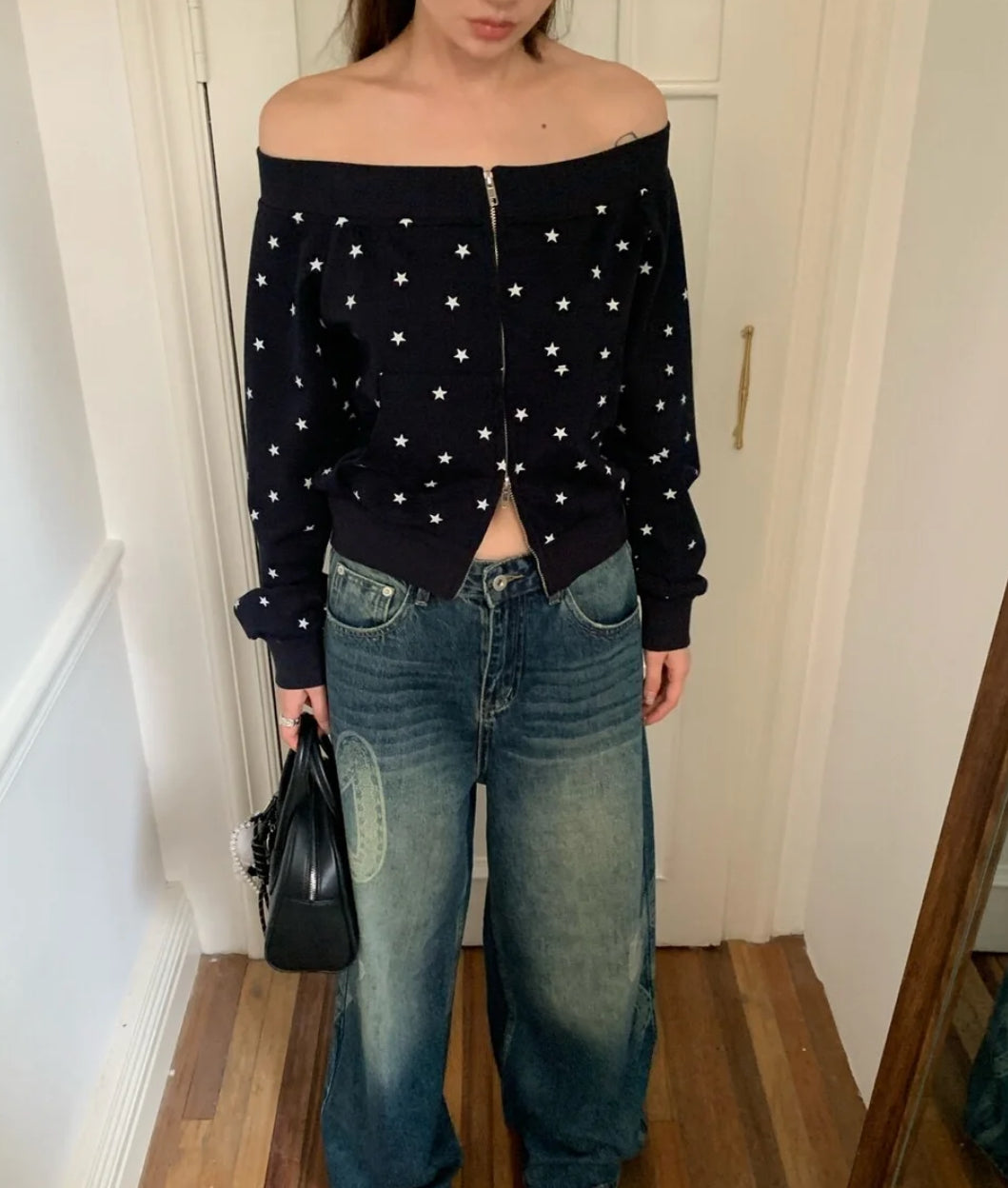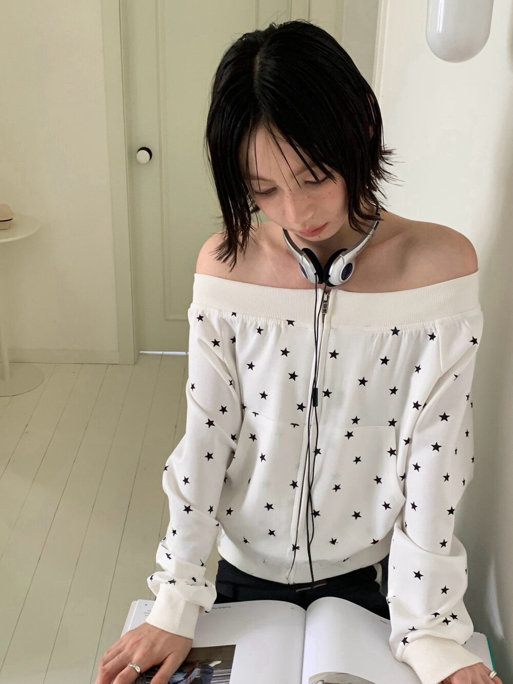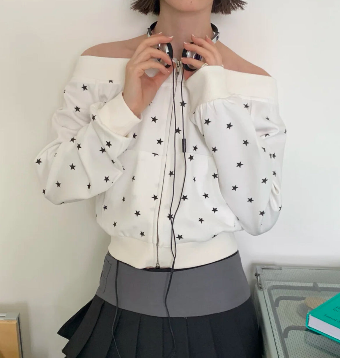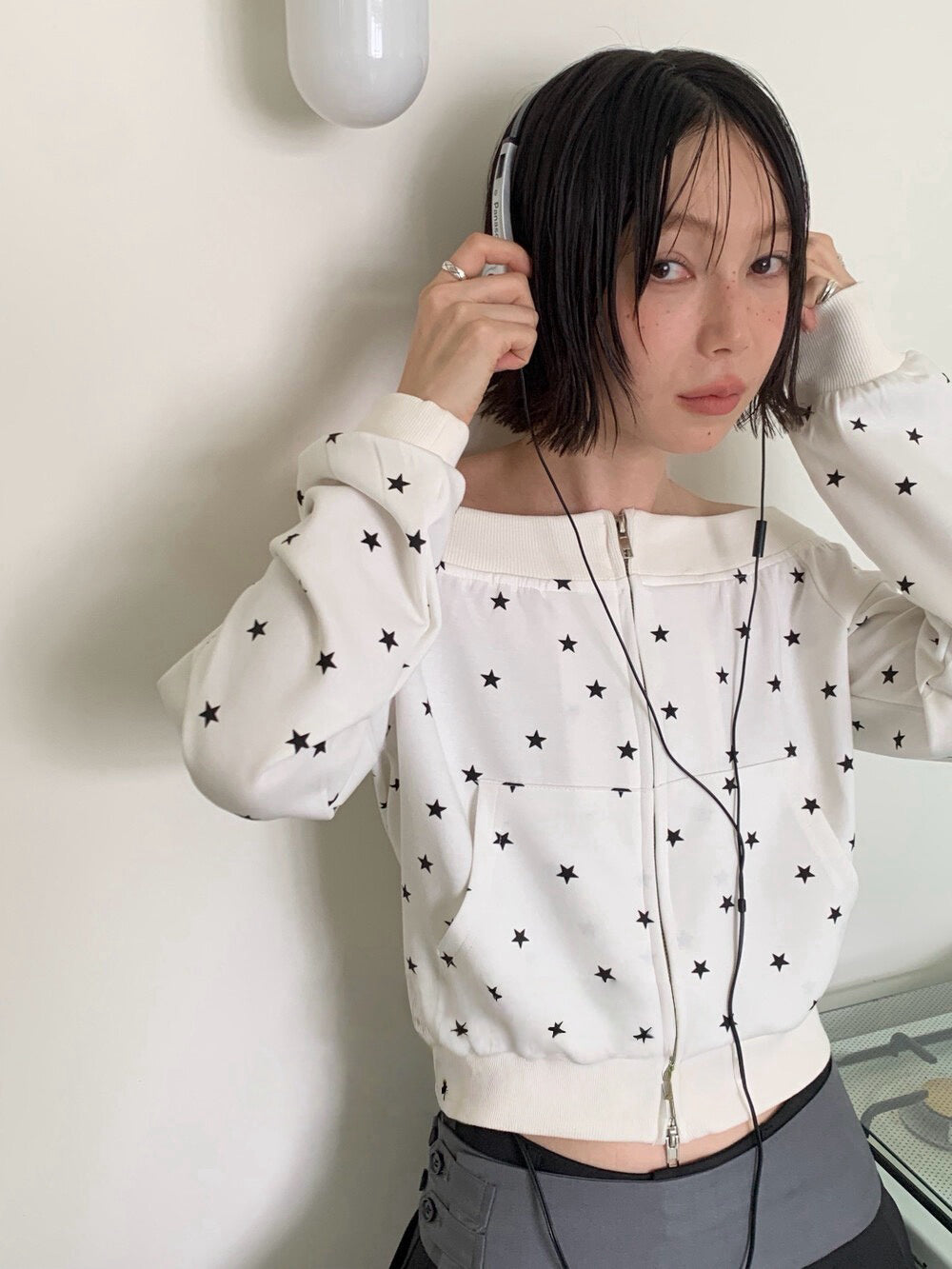 Star print one-shoulder double zipper top