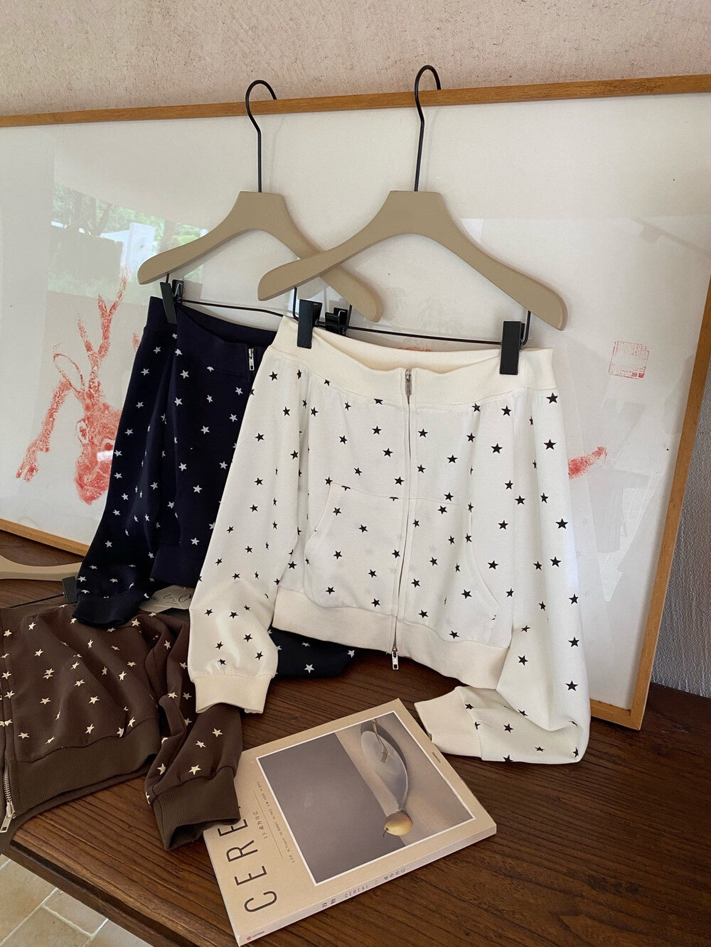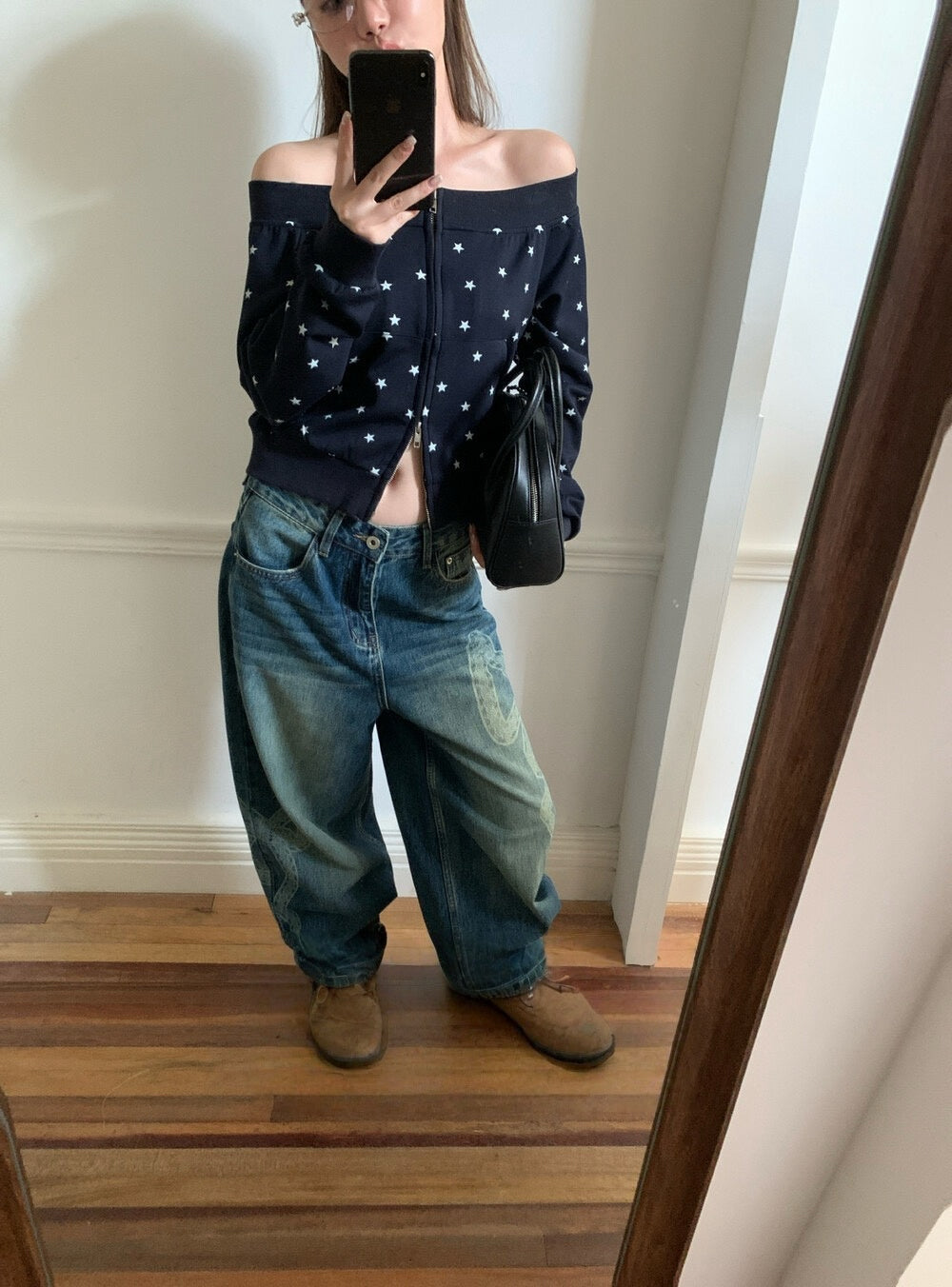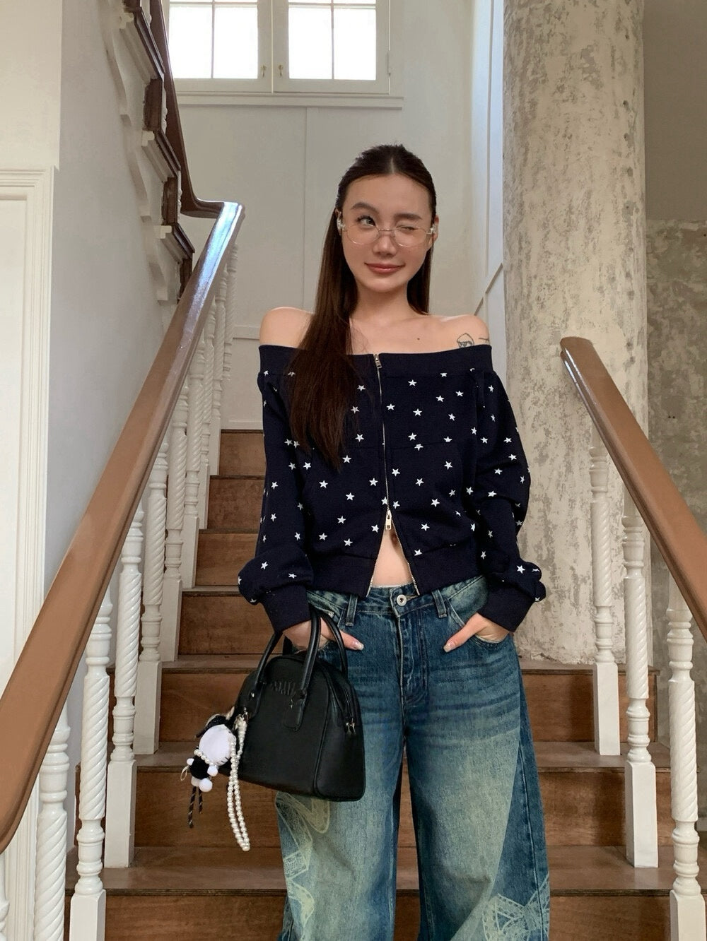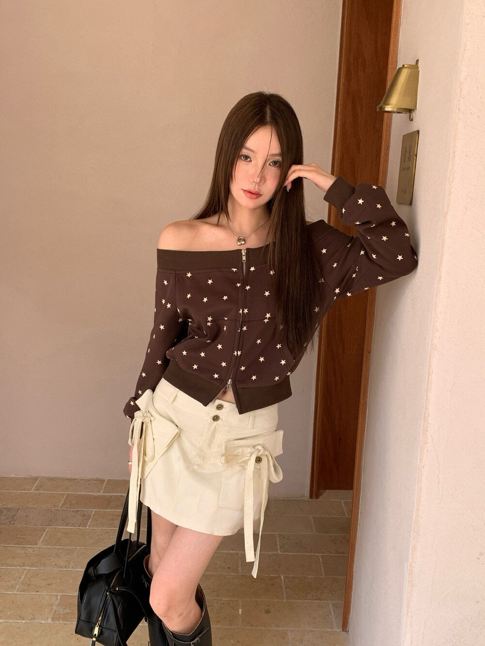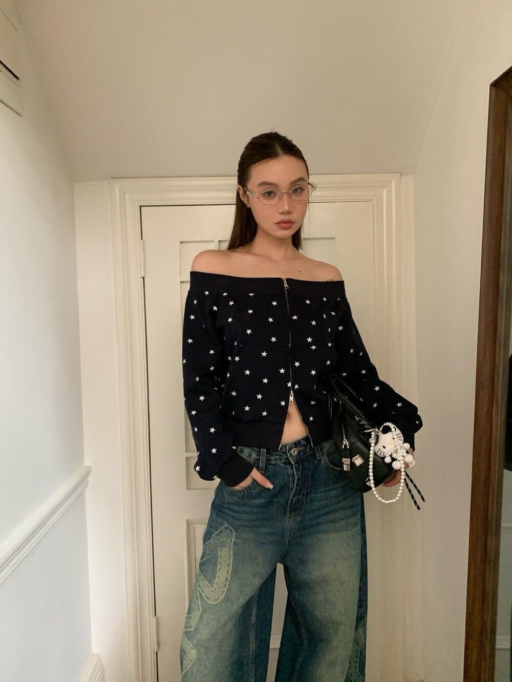 Star print one-shoulder double zipper top