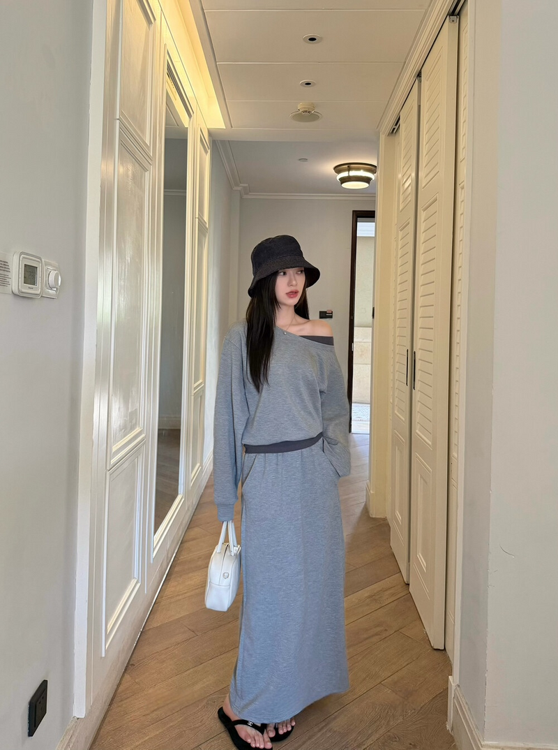 Contrast slope shoulder top and long skirt 2-piec set