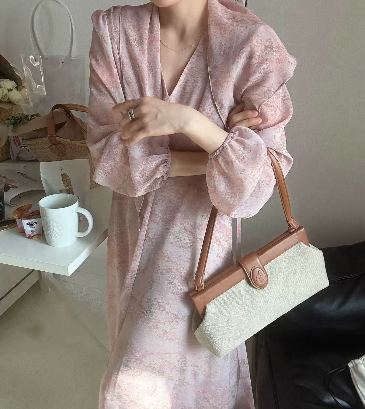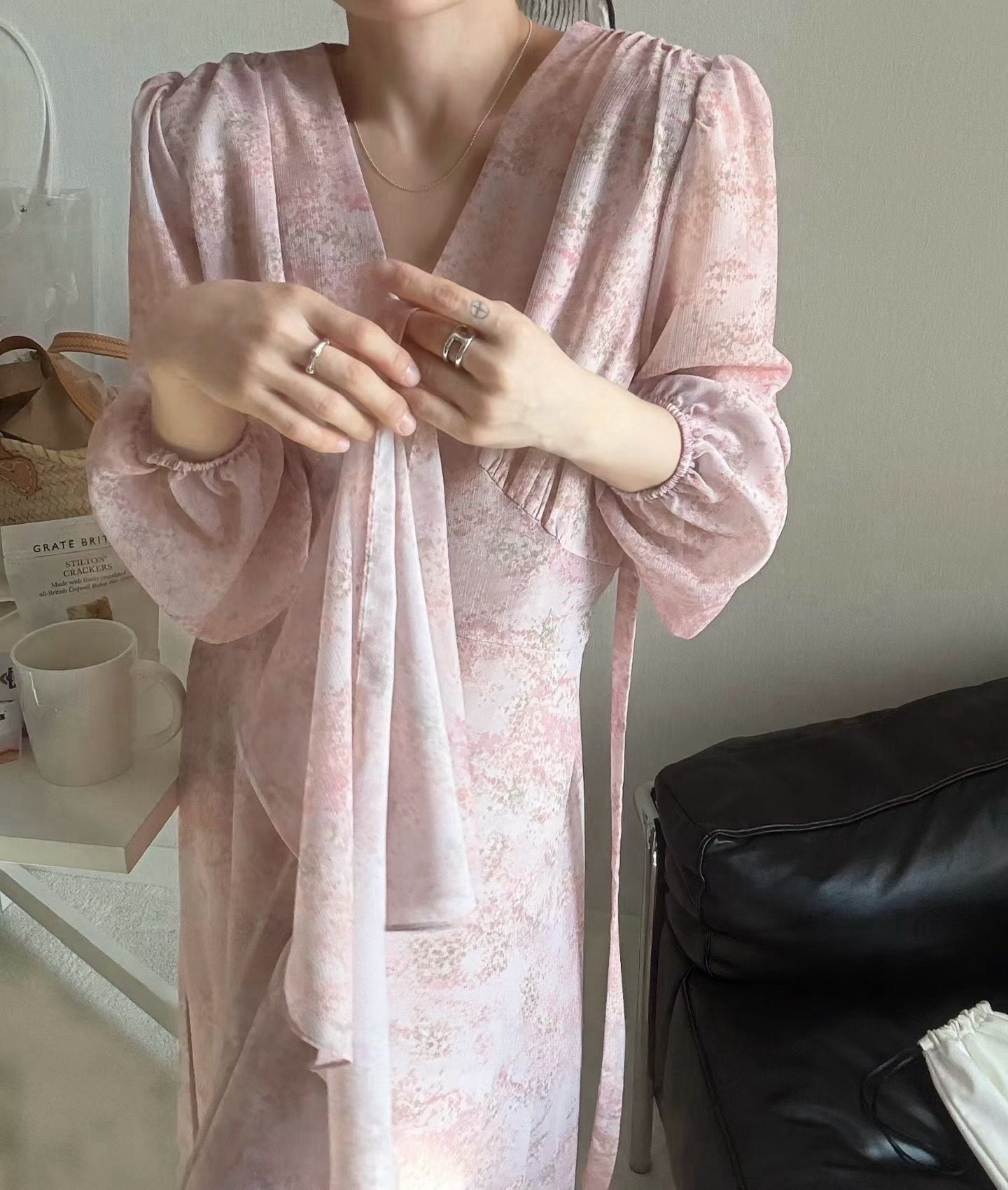 IMISSYOU V-neck floral long dress with scarf in Pink