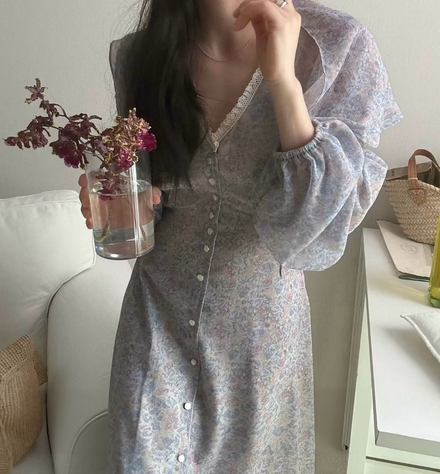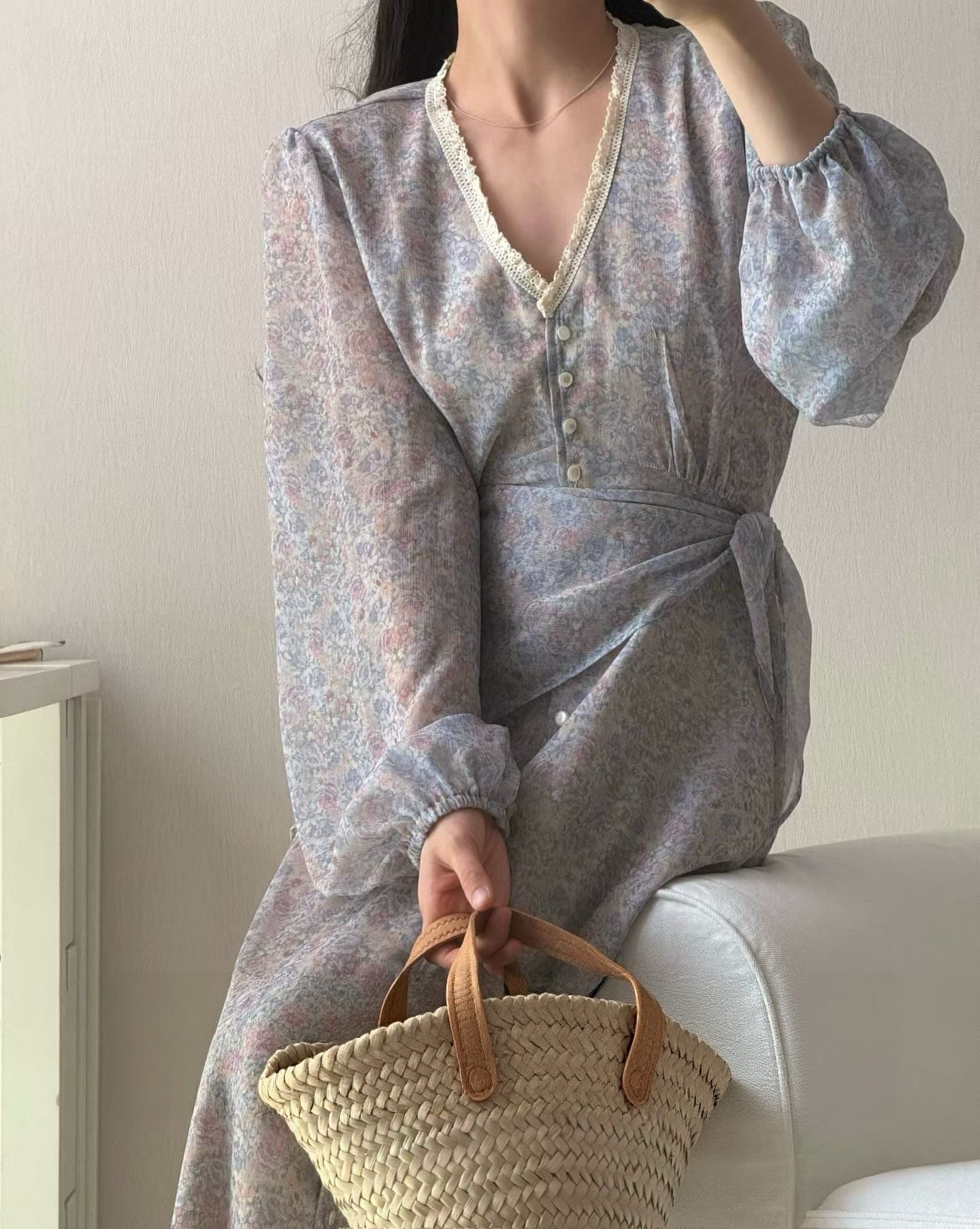 IMISSYOU V-neck lace trim button long dress with scarf in Purple