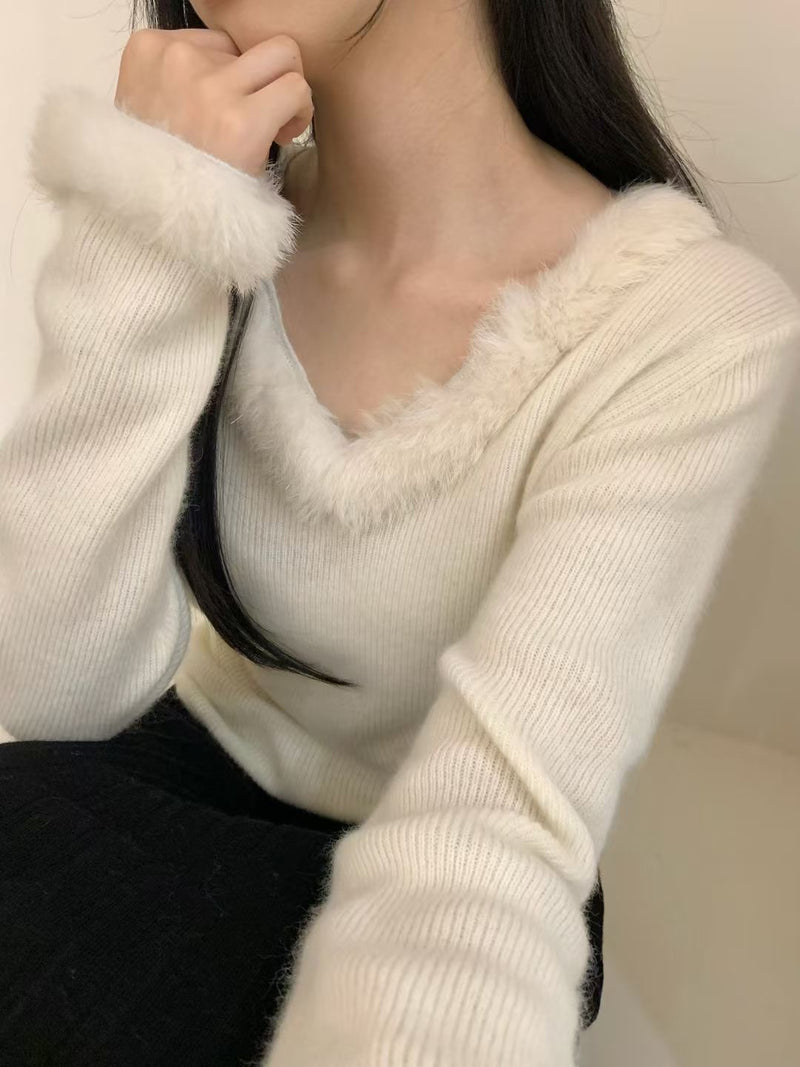 Eco-fur trimmed V-neck sweater