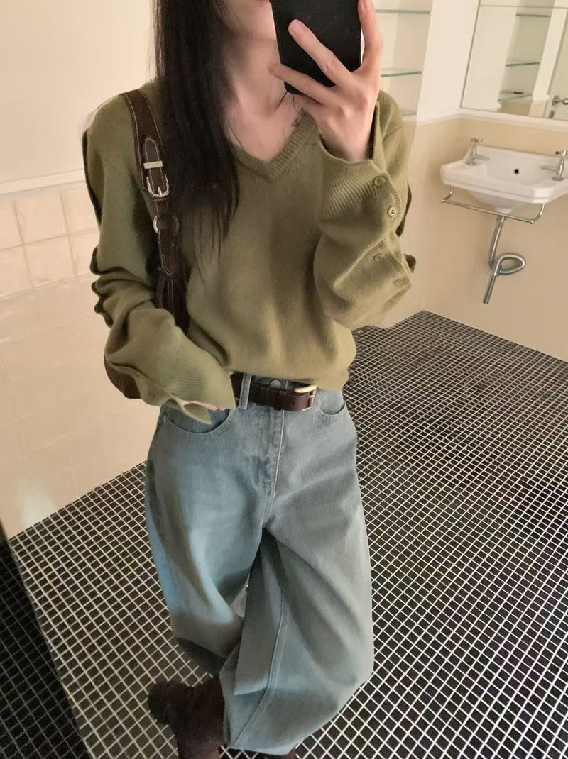 Side button V-neck sweater