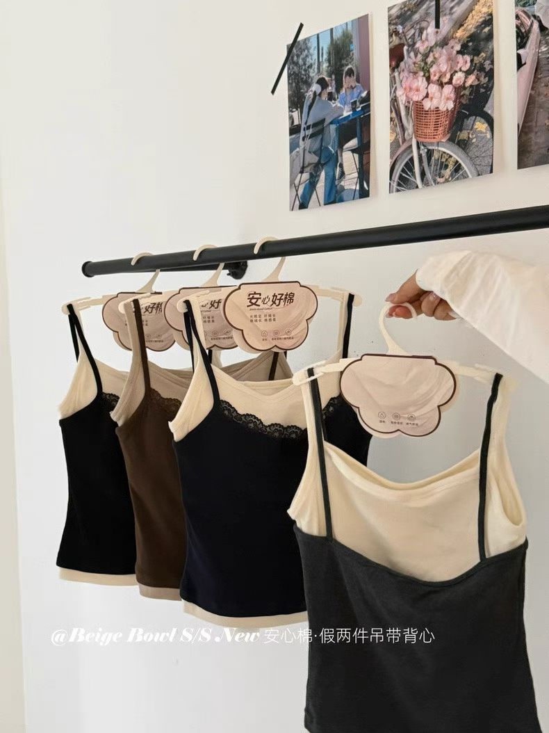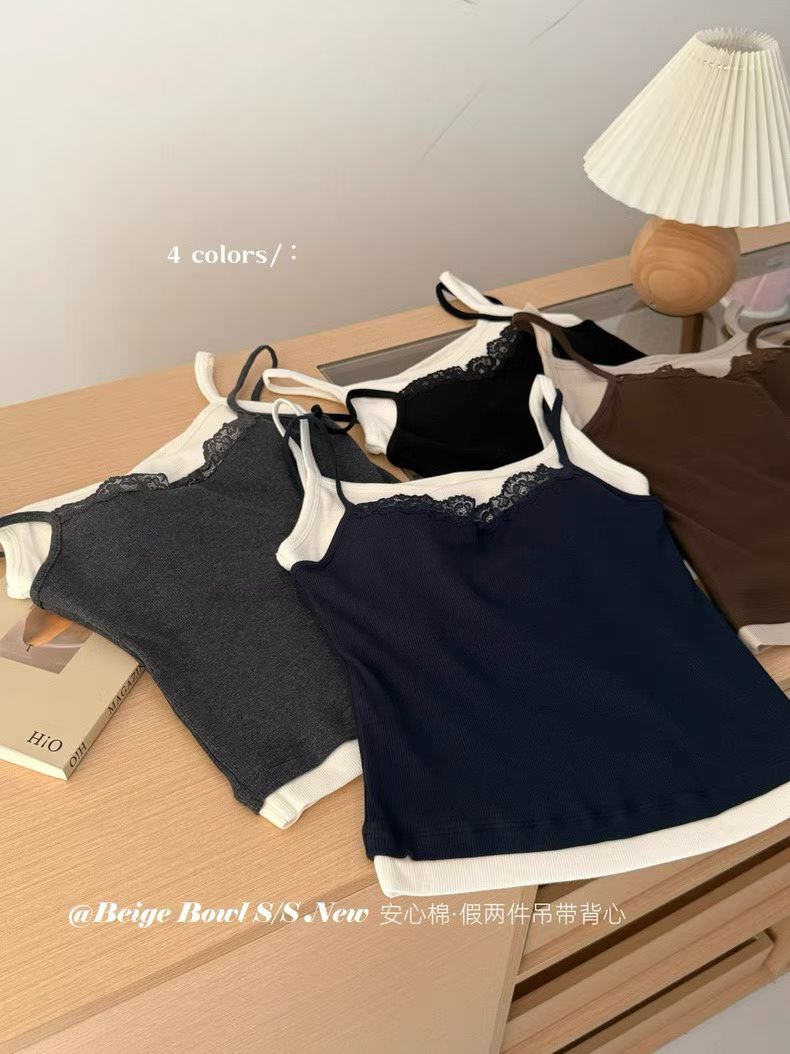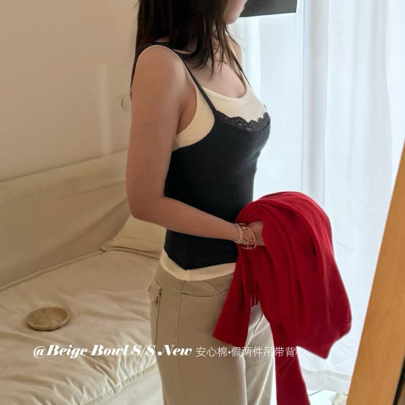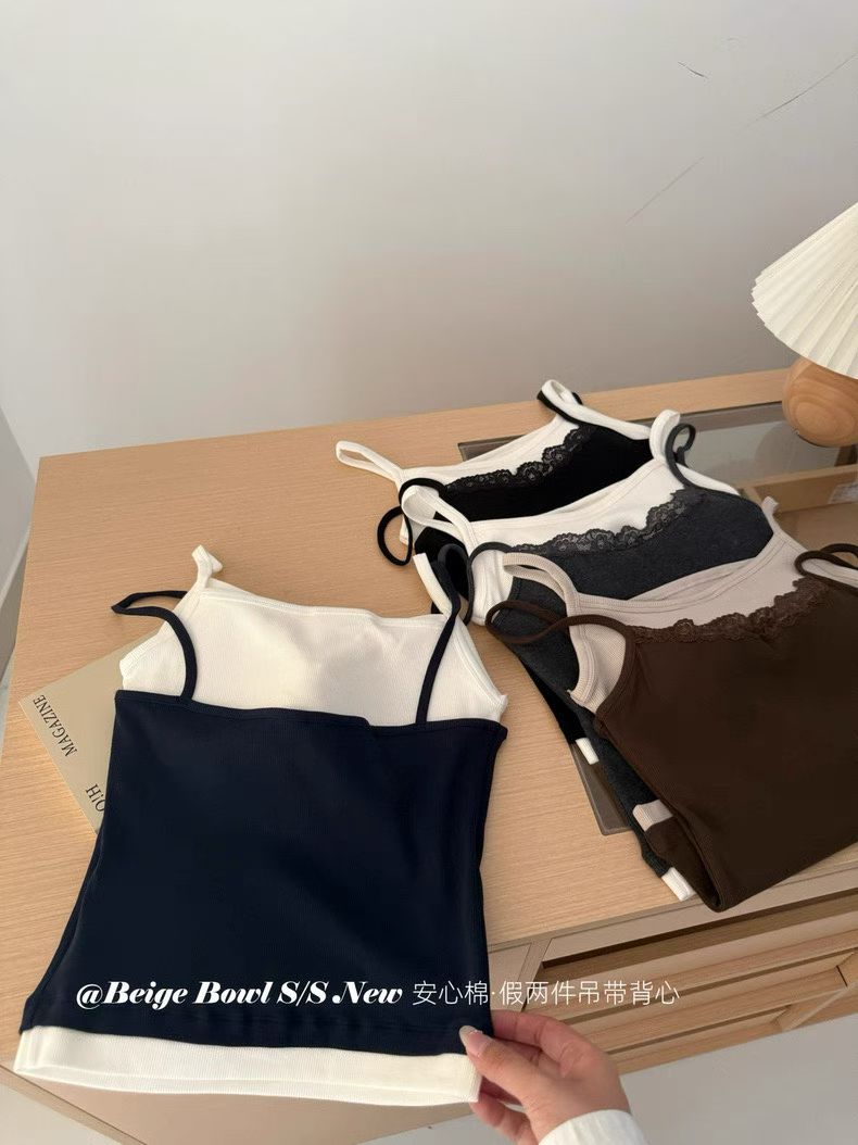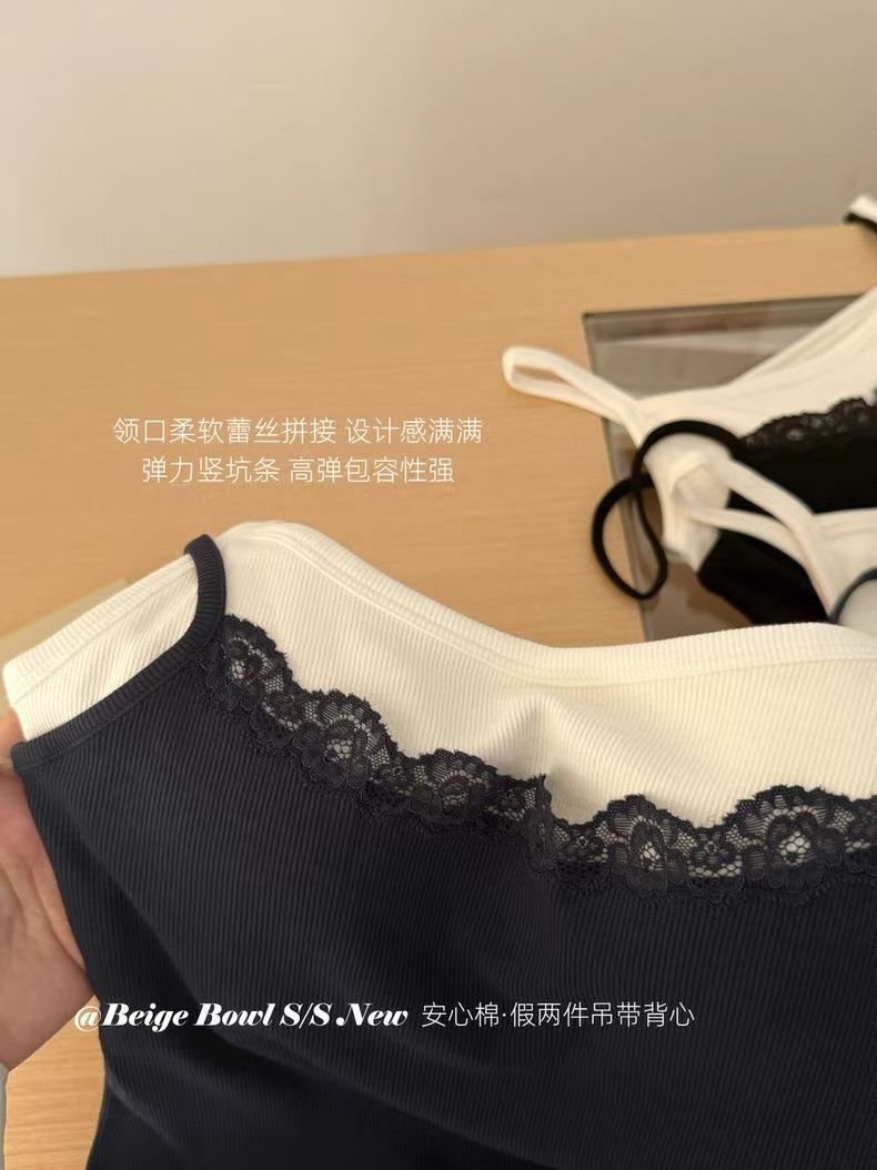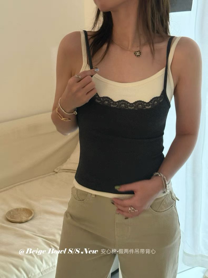 Slim strap fake 2-piec lace tank top